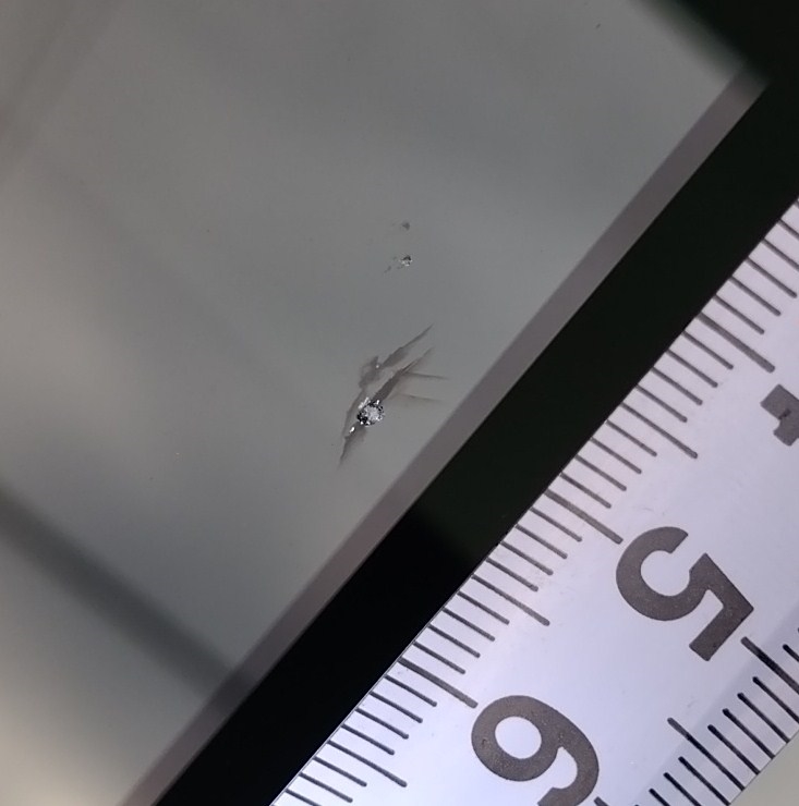 飛び石でガラスに亀裂。(水やゴミが入り込まないようにすぐテープを貼りました)