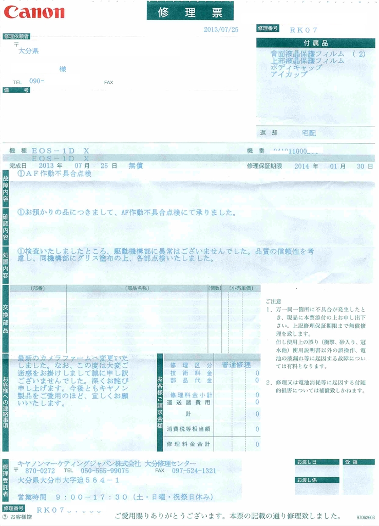 『1回目修理伝票』CANON EOS-1D X ボディ eos3drsさんのクチコミ掲示板画像1/1