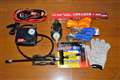 コンプレッサは最安値品、ペンチ等最低限必要な工具は100均品、パンク修理ゴムと雑巾タオル懐中電灯。