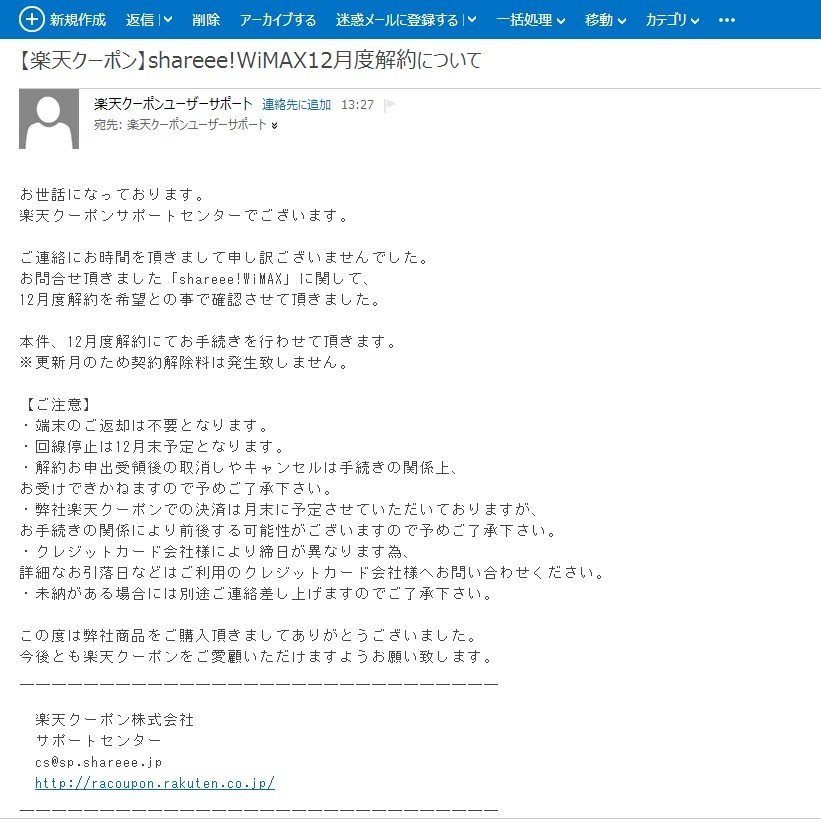 『解約の連絡受理のメール内容』NEC AtermWM3600R PA-WM3600R(AT)B [ブラック] まぐたろうさんのクチコミ掲示板画像1/1