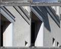 解像度はほんの少しEF24-70が上。壁面の立体感の表現は似たようなもの。植え込みの木の立体感はほんの少しEF24-70が上。