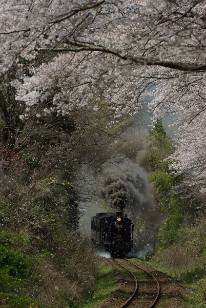 桜吹雪の中力走するSL人吉号