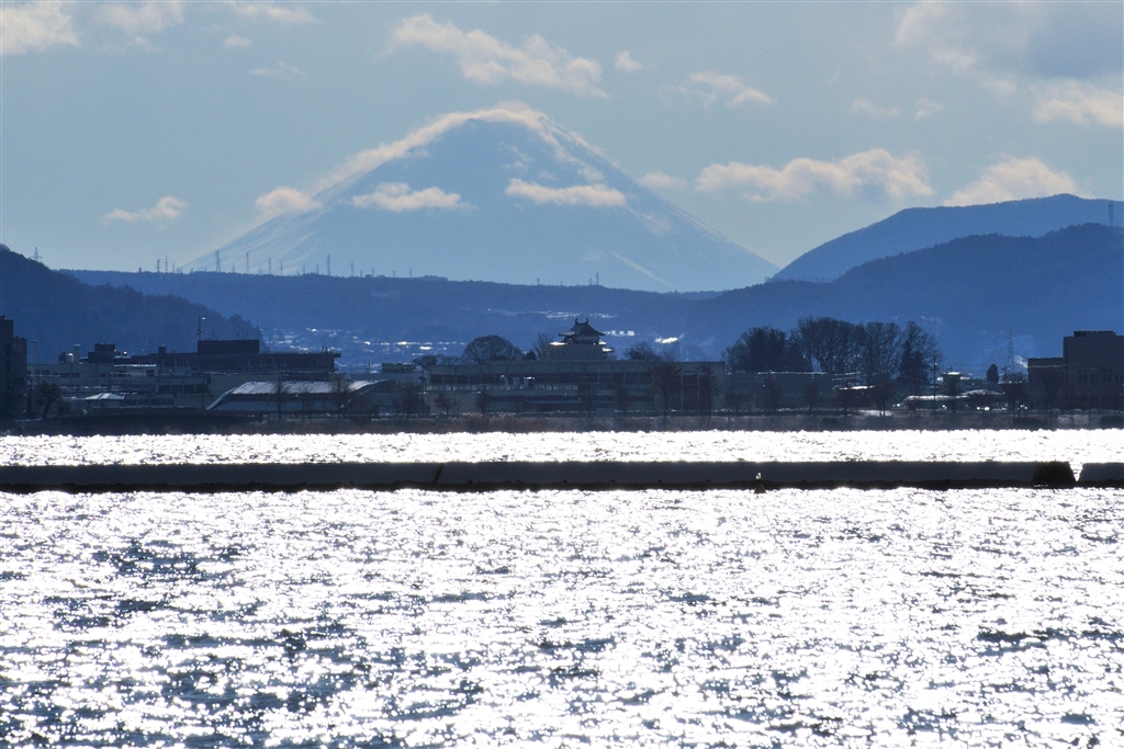 手前から:諏訪湖、高島城、富士見峠、富士山