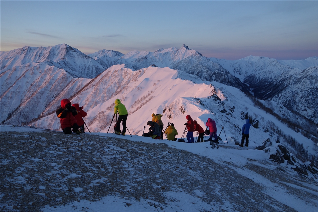 朝焼けでピンク色に染まる稜線と槍ヶ岳、一眼レフを構える登山者たち・・・
