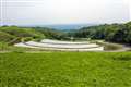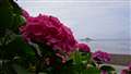 風流島を背景としたアジサイ写真、島の話をお聞きすると、歴史を感じますね。