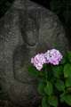 特に1枚目の緑の木に埋もれた赤い寺を背景にアジサイが賑やかに咲いている写真と3枚目の石塔とアジサイの写真が良いと思います。