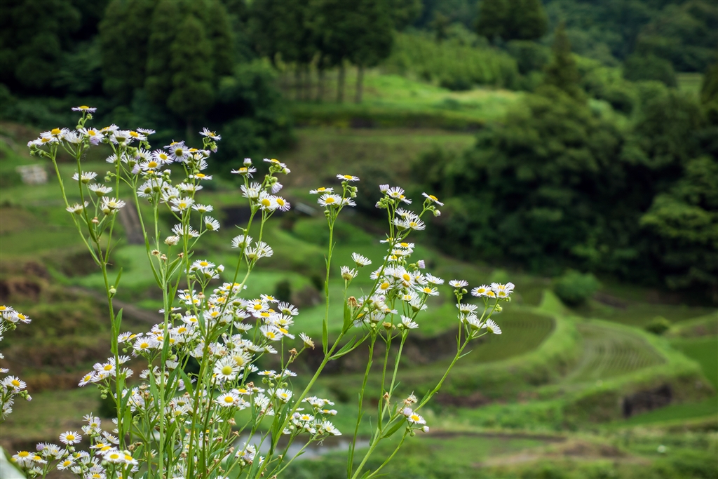 棚田を背景にヒメジョオン