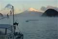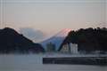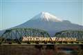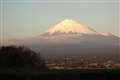 遠くに見える美しいシルエットは、富士山でしょうか。
