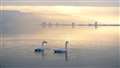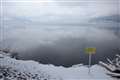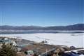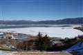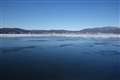 うっすらと降雪の日、全面結氷の諏訪湖も雪化粧でした。