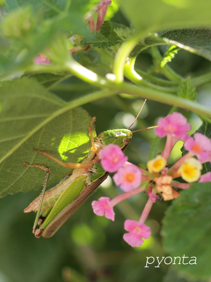 台風で飛ばされてきたのでしょうか、ランタナにイナゴが棲みつきました。