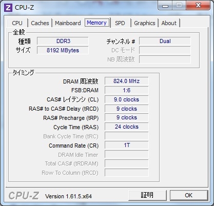 『図3 『CPU-Z』によるメモリ情報(Memoryタブ)。』Patriot Memory PVI38G160C9K [DDR3 PC3-12800 4GB 2枚組] 三間飛車さんのクチコミ掲示板画像3/4