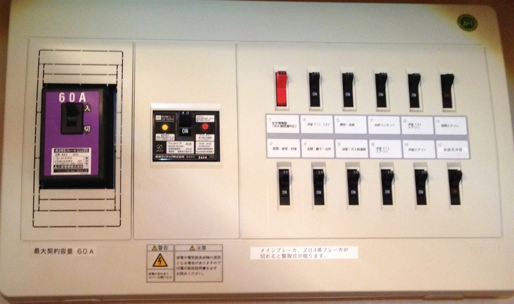 左から2番目が2系統(各40A)分岐ブレーカー
