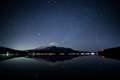 この日は湖面が水鏡のようでした、今の時期3:00時過ぎくらいからオリオンが富士山に降りて来ます、