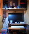 とのことですが、その原因は、やはり、「パソコンデスクの上段にあつらえた棚の上に設置」ということで、以上の本来必要な作業ができないことにあると思っていいと思います。つまり、機器のせいにするのはおかどちがい、という解釈が正しいと思います。