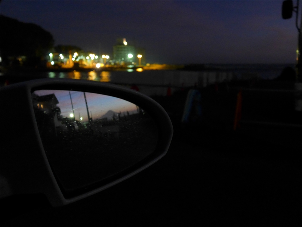 台風18号一過写真の後、車の運転席からミラー越しに富士山。前のボケはヨットハーバー
