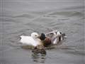 カルガモの雌の中にオシドリの♀ 駐車場から50mのところに |