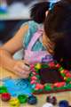 至近距離から、解放付近、少〜し薄暗い店内、娘が動く、粘土を動かす、