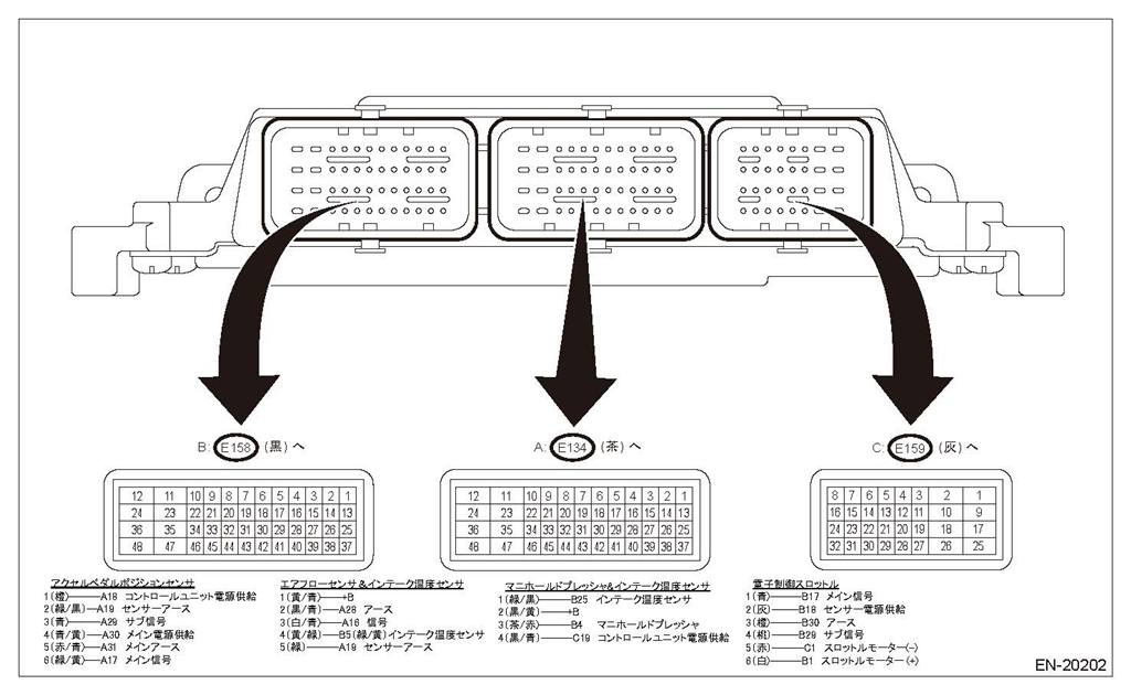 センサ別コネクタ番号(線の色)→ECUのコネクタ(線の色)