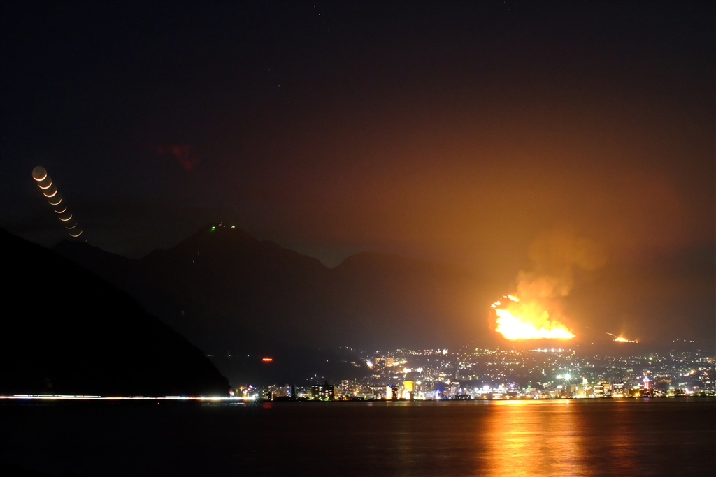 山焼きの火が海面に映って綺麗です。