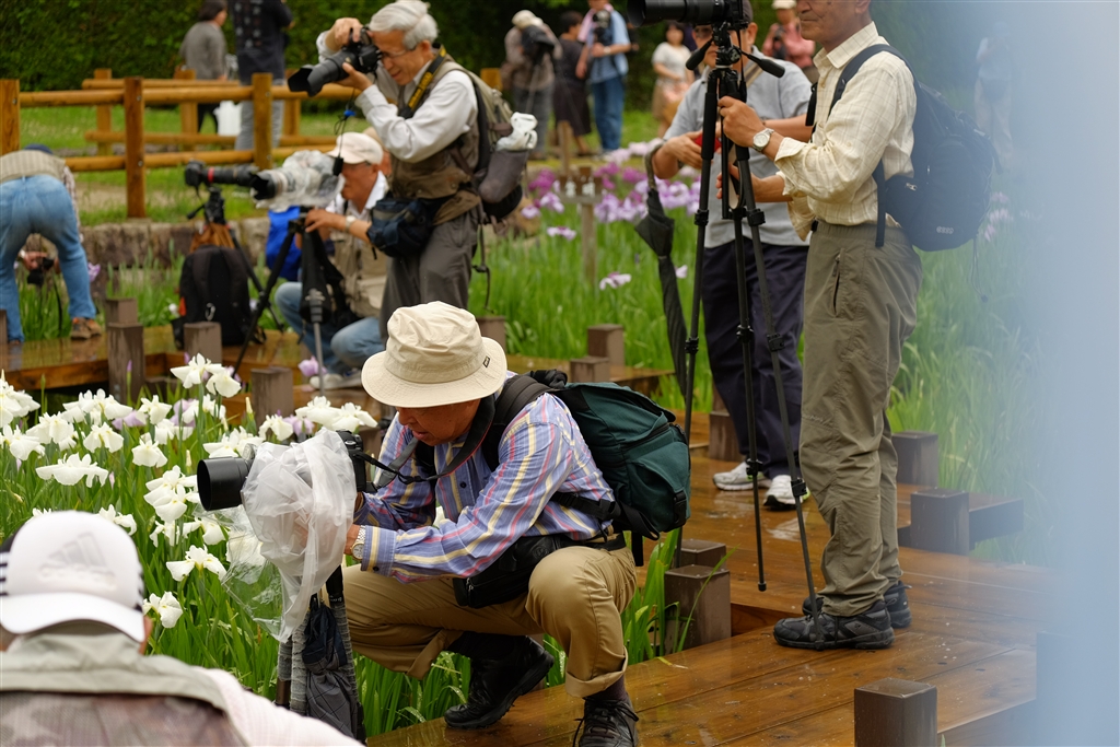 菖蒲と勝負する人々 *右側 ビニール傘がハーフND不意ルター