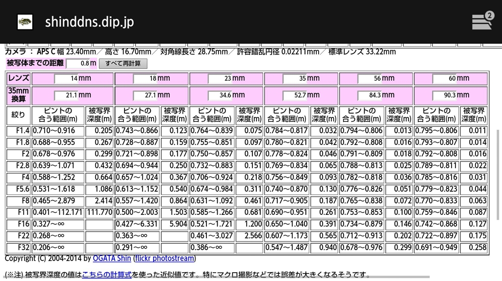 APS-Cの被写界深度一覧です 56oF1.2は1cm前後だと思われます