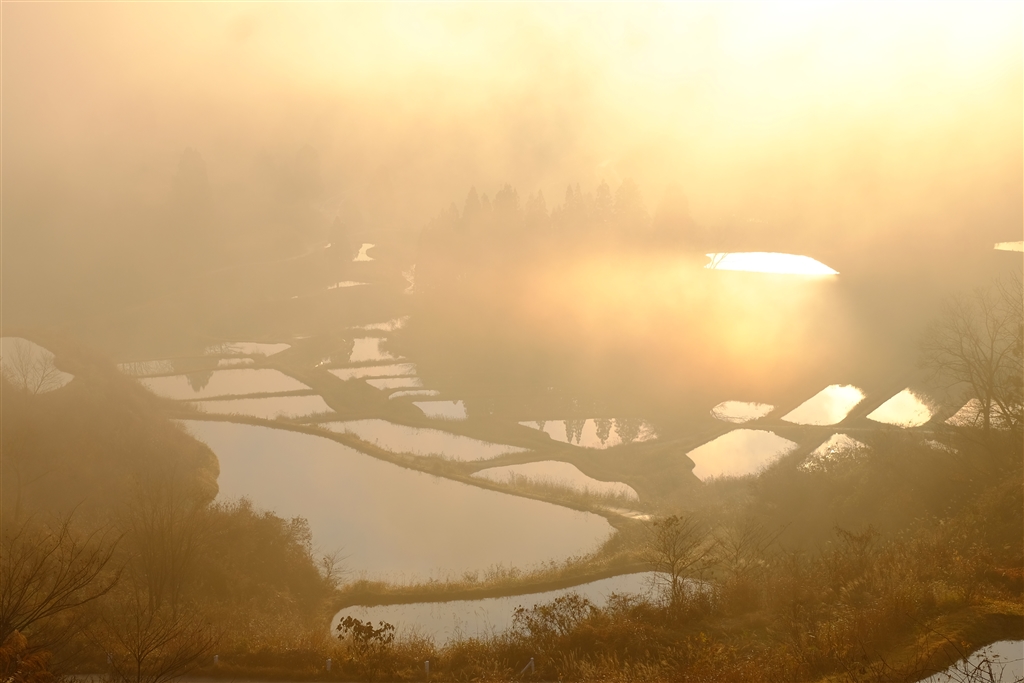 霧の中、棚田を目指す太陽