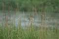 川岸で15m程度先の葦にとまったコヨシキリ、背景には対岸(50m)や川の水面(30m)がある状況です。