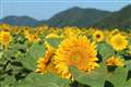 ・今日の目的地は隣町の神社でした。境内のひまわりと本殿,境内ではセミ時雨の渦でした。