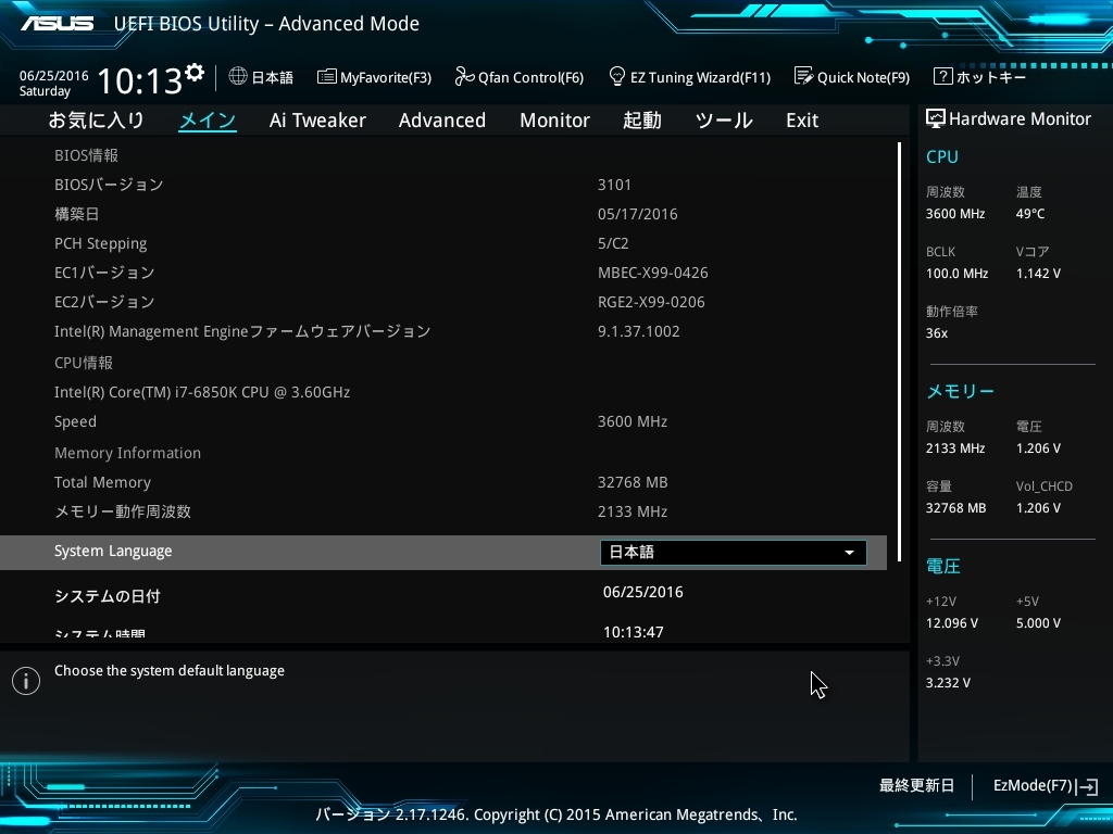 『UEFI画面』ASUS X99-E WS 野良猫のシッポ。さんのクチコミ掲示板画像1/3