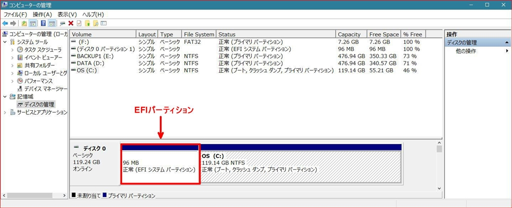 ディスクの管理 → UEFIパーティション