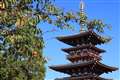 向かって左側の赤い門の背後に見えます。