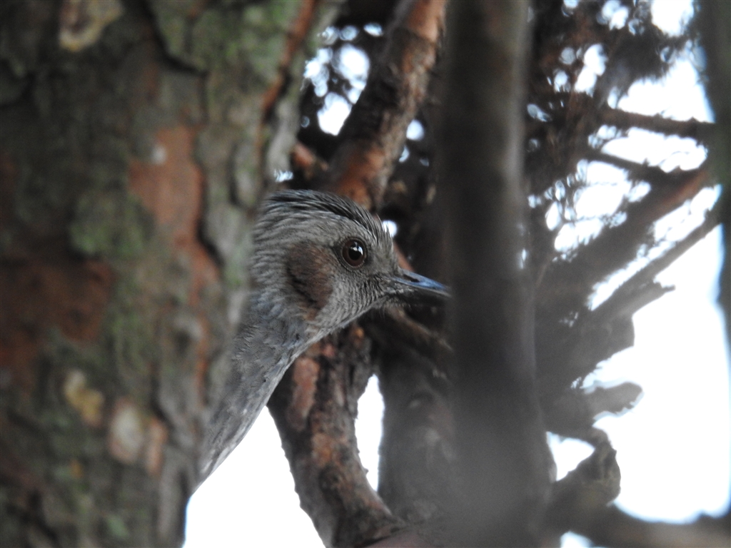 今日はヒバの枝陰に隠れています