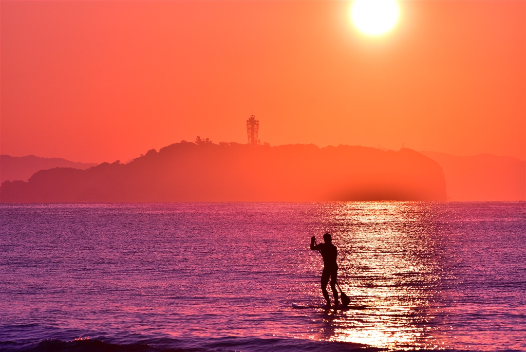 朝陽とサーファー