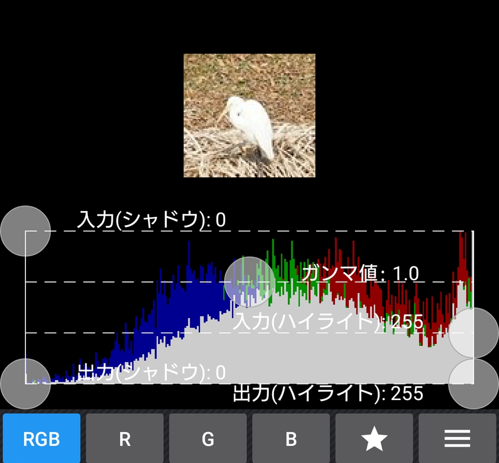 この程度に広げただけで白飛びシラサギのヒストグラムが消滅寸前
