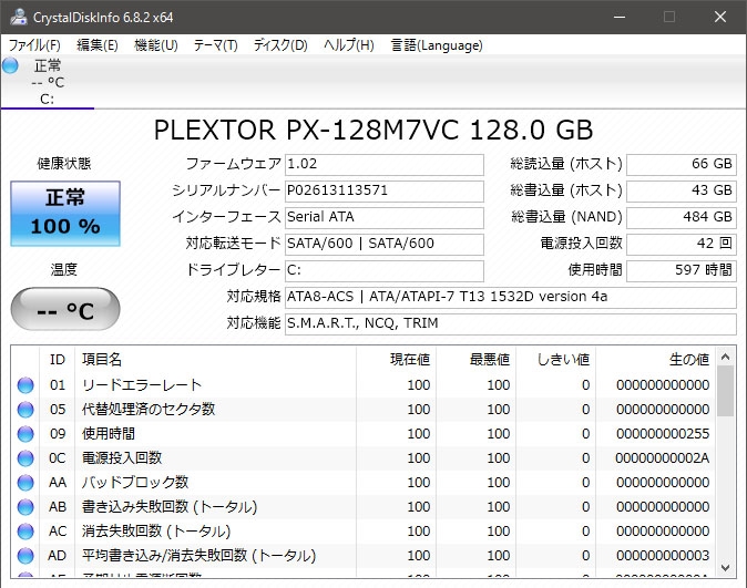 『CrystalDiskInfo 6.8.2 x64』PLEXTOR M7V PX-128M7VC ほげ2016さんのクチコミ掲示板画像4/4