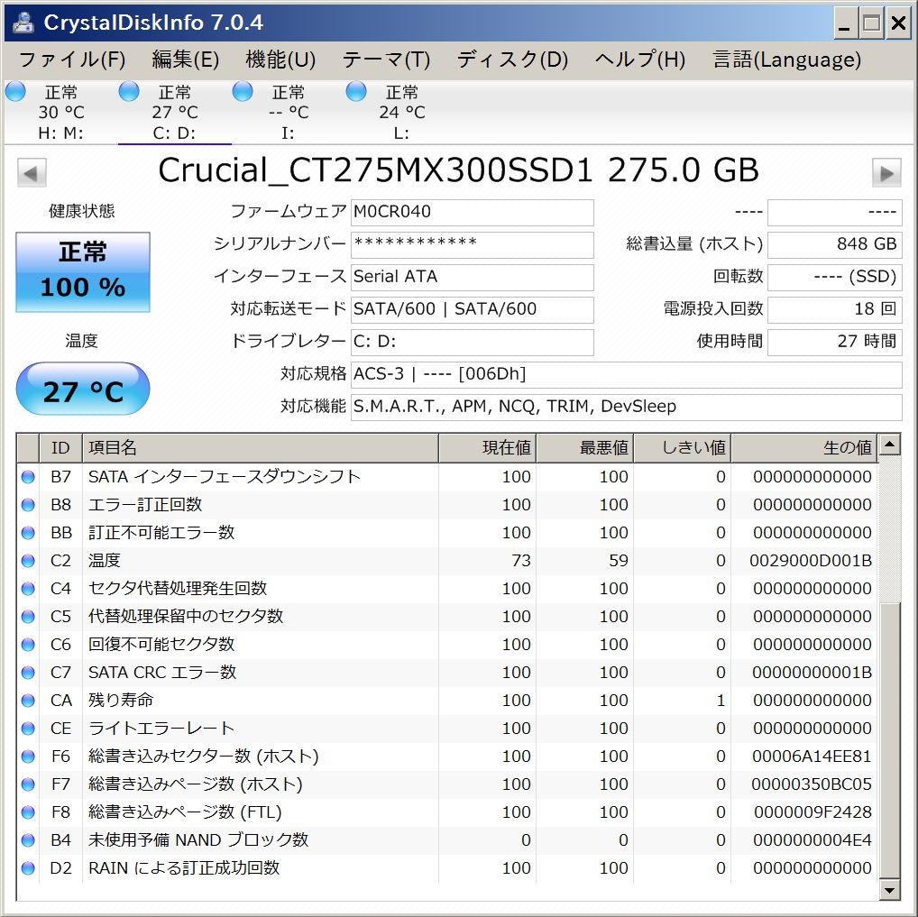 『今現在での結果』crucial MX300 CT275MX300SSD1 翠緑柄眸さんのクチコミ掲示板画像1/1