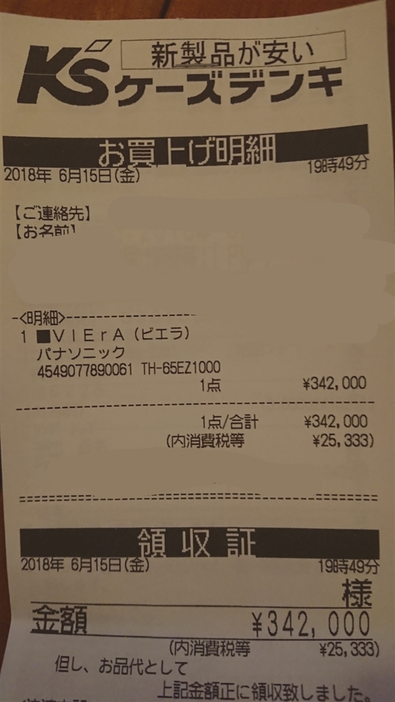 『レシート』パナソニック VIERA TH-65EZ1000 [65インチ] 落花生NO1さんのクチコミ掲示板画像1/1