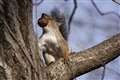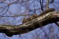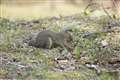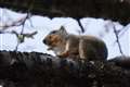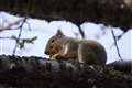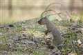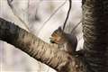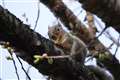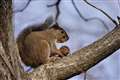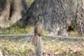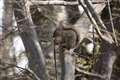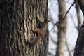 リスが木から木へ移ったと思いきや、地面へ下りるや草株を丸ごと引き抜いて枝上へ…