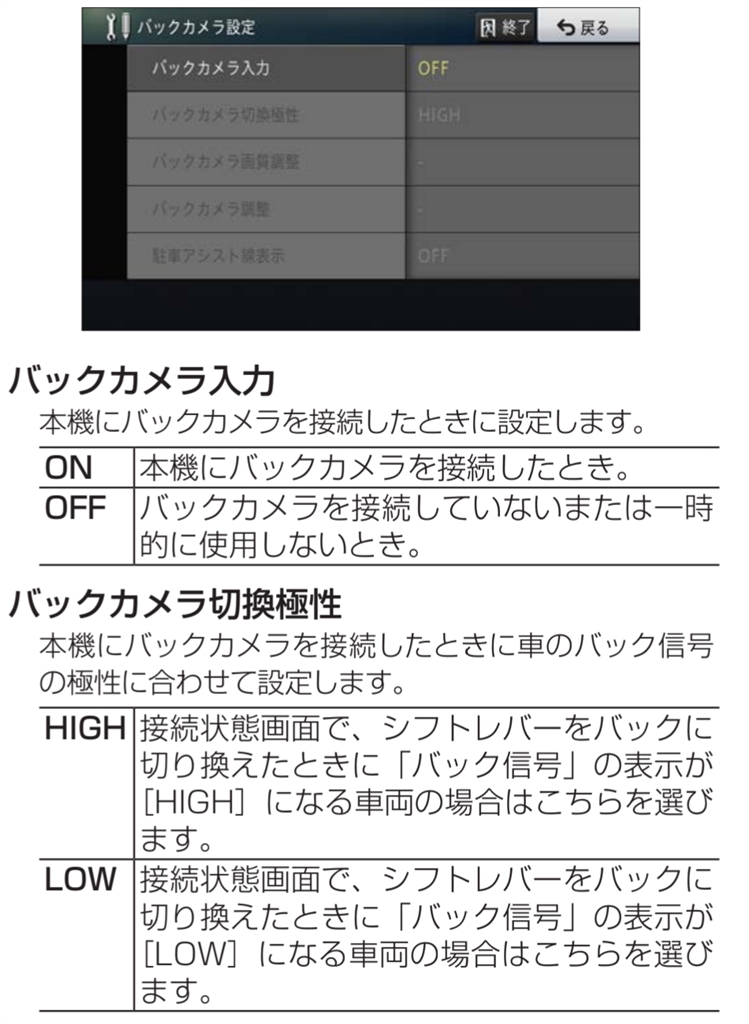 バックカメラ設定画面