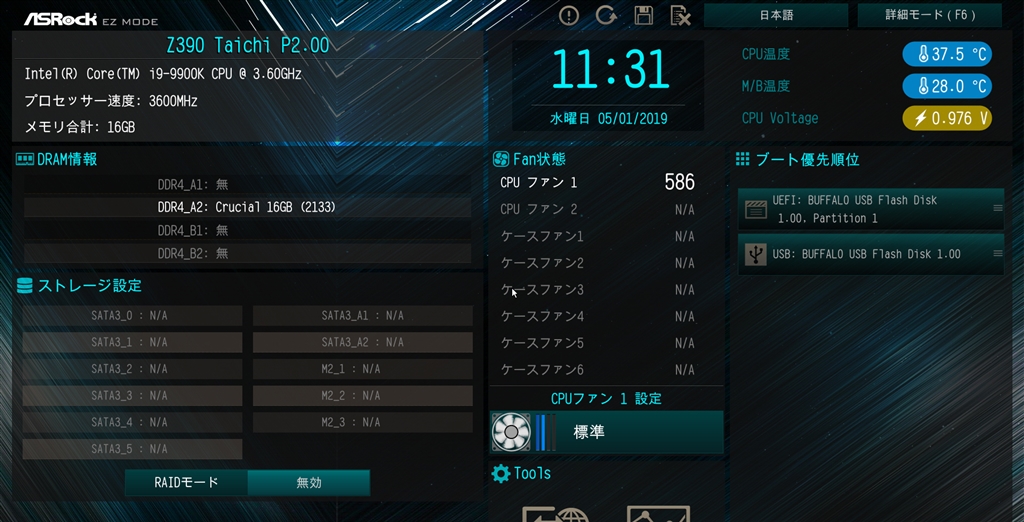 biosのCPU温度37.5度