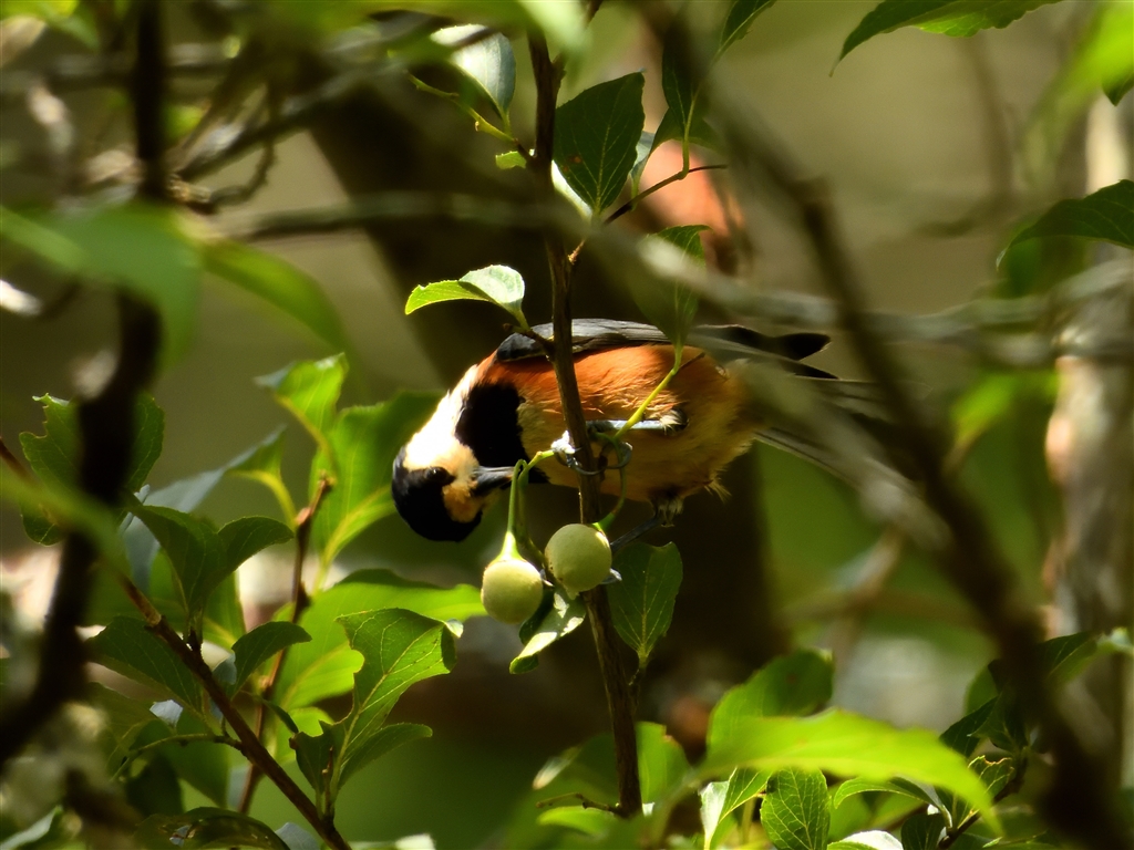 ヤマガラは大好物の木の実にぶら下がってもいでいました@3000mm