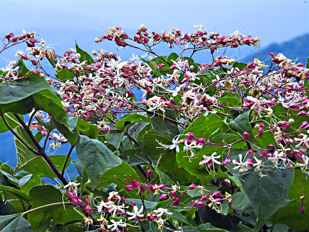 クサギ(臭木)花は萼から長く突き出し開き、蕊はその中から更に突き出す。葉に悪臭