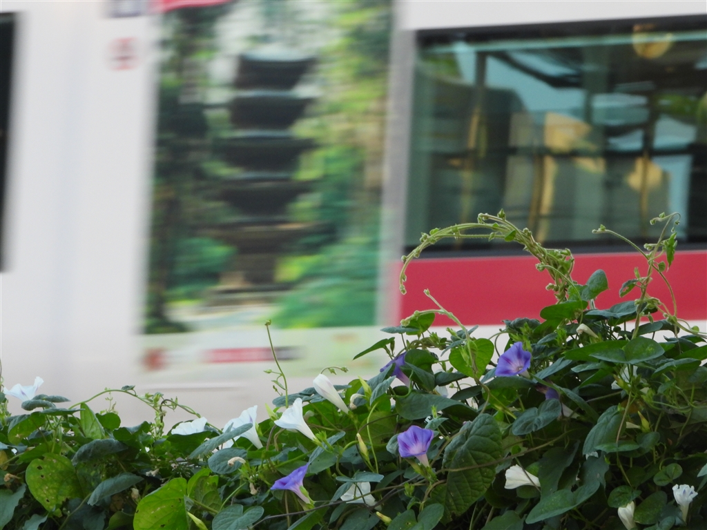 特急をバックに花を写していたら車体に旅心をくすぐるプリントが・・・秋ですね