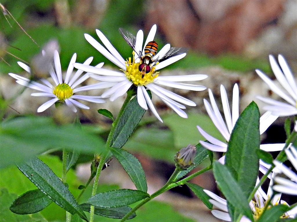 ノコンギクと蜜蜂 舌状花は細長く、色は白〜薄紫まであり、葉には粗い鋸歯