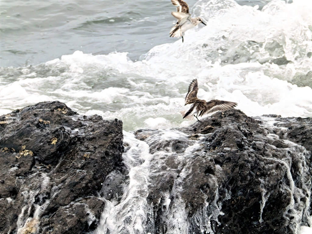 波を足元に浴びたシギが飛び立つ瞬間を狙うも