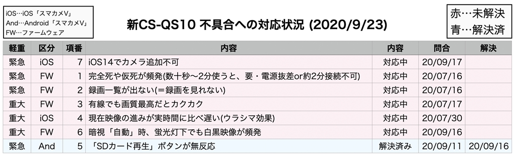 新CS-QS10 不具合への対応状況 (2020/9/23)
