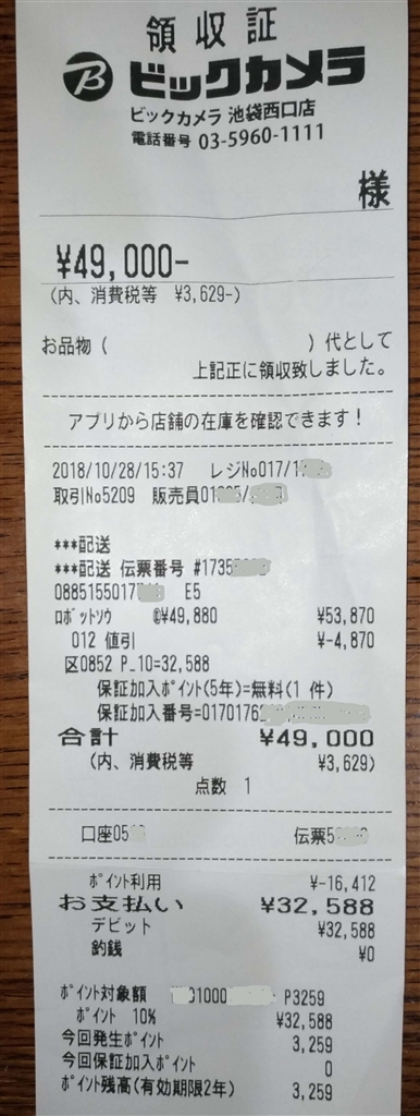 ルンバ e5の領収書