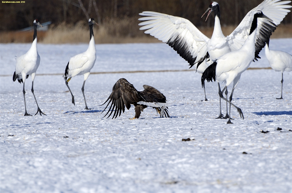 右足の爪で魚を摘まみ上げ。横取りされて怒る丹頂。