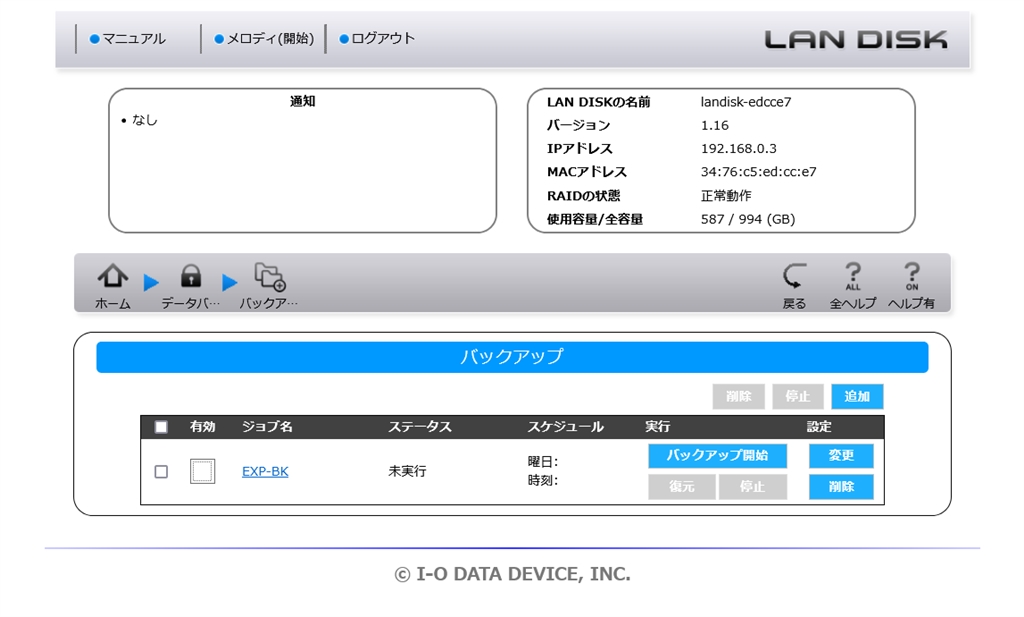 『バックアップ設定の保存後の管理画面』IODATA LAN DISK A HDL2-AAX4/E yukin_koさんのクチコミ掲示板画像1/1