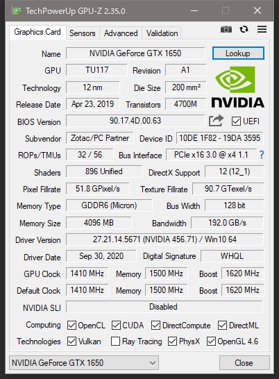 ZOTAC GAMING GeForce GTX 1650 OC GDDR6 ZT-T16520F-10L [PCIExp 4GB]